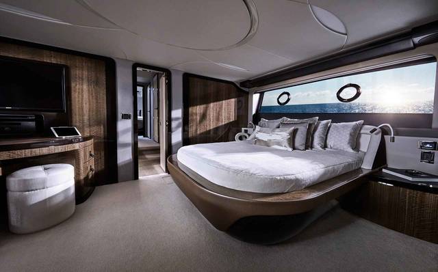 サロン内には前方に操舵席とソファ、後方にギャレーを配置。さらに、サロン階下には2メートル超のヘッドクリアランスを確保した3つのベッドルームを用意し、それぞれに専用のシャワールームも完備させている。