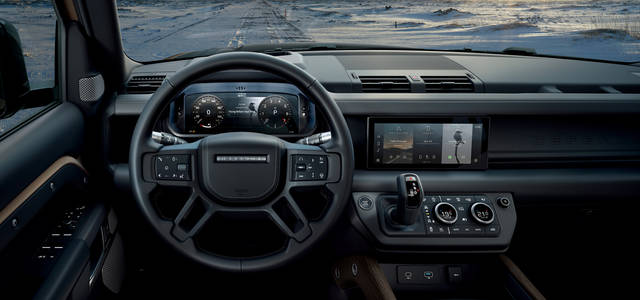 インテリアにも、通常では見えないように設計されている構造物や装具をあえて露出させたり、新開発のシートアレンジ(オプションのジャンプシート使用時)とダッシュボードに移したシフトセレクターによる3人掛けフロントシートを実現させたりと、71年前に登場した初代ディフェンダーのエッセンスを新たな形で取り入れている。