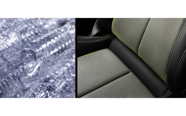 またサステナブルな取り組みの一環として、Sラインの標準シートのクロス部分に、リサイクルペットボトルを原料とした素材を採用。1台分のA3のシートで、1.5 リッター容量のペットボトル換算で最大45本分をリサイクルして使用している。さらにフロアカーペットなどにもペットボトル62本分がリサイクル利用されているほか、インテリア以外のコンポーネントも、断熱材や吸収材、ラゲージコンパートメントのサイドパネル、積載フロア、マットなどにリサイクル原料が使用されている。
