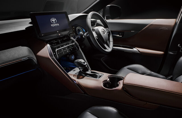 インテリアは、心地よく上質な空間となるべく、馬の鞍をイメージした幅広のセンターコンソールを採用したほか、厚皮を曲げてできる自然なシルエットをイメージしたレザー調素材や「曲木(まげき)」に着想したウッド調加飾、パイピング加飾などを随所に使用。柔らかい光が差し込む調光パノラマルーフはトヨタ車として初採用となる。