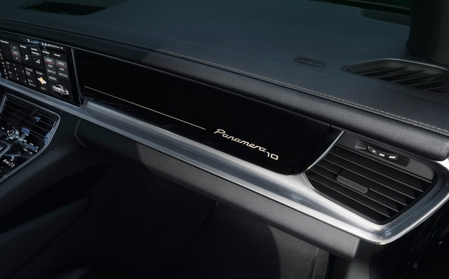 エクステリアでは、フロントドアにホワイトゴールドメタリックの“Panamera10”のロゴが与えられ、足元にも同色の21インチスポーツデザインホイールを装着。ブラックのパーシャルレザーにホワイトゴールドのでデコレーティブステッチが与えられた室内でも、助手席側トリムパネルとドアエントリーガードが専用ロゴで彩られる。