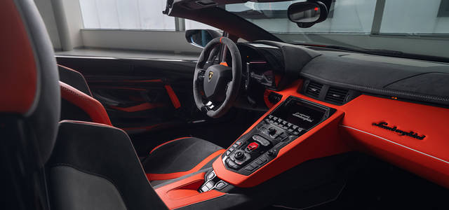 今回ペブルビーチで公開された個体は、Grigio Acheso(マットグレイ)のカーボンファイバーのエクステリアをまとったもので、「SVJ」と「63」のロゴ、ホイールのセンターロックをArancio Dac(オレンジ)としたもの。インテリアはGrigio Octans(グレー)、Grigio Cronus(グレー)、Arancio Dryope(オレンジ)の3色のアルカンターラにカーボンファイバーとカーボンスキンが組み合わされたものだった。