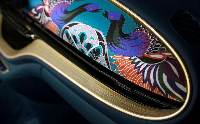 インテリアは、ブルガリのアイコン「ティーヴァ ドリーム」の扇型モチーフを採用した彩り豊かなシルクで覆われたダッシュボード、ダイヤモンド、アメシスト、シトリン、トパーズがあしらわれ、取り外してブローチとして使えるステアリング センター部のB.500オリジナルロゴ、オーダーメイドのジュエリーケース、ダッシュボードと同様の色とデザインを施したレザーシートなど、まさに“ジュエルカー”と呼ぶにふさわしい内容になっている。