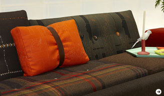 Maharam社のヘラ・ヨンゲリウス コレクション「Layers」と「Borders」は、植物がモチーフとなった特徴的なテキスタイルで、コンピュータ技術と最新の機械による裁断・縫製で、細かいモチーフが刺繍やレイヤーとして生地に施されたもの。それに加え、彼女が選定した「Cobblestone」「Exaggerated Plaid by Paul Smith」「Mohair Supreme」「Hallingdal」の4種の張り地によって、このソファは包まれる。4種はいずれも、Maharam社のデザインスタジオと、同社が2001年よりパートナーを組んでいるKvadrat社によるエクスクルーシブなテキスタイルだ。