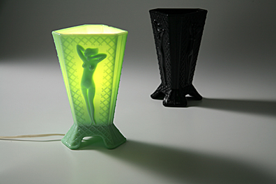 また、そこには同時にアール・ヌーヴォーからアール・デコへと芸術様式が変遷する、ヨーロッパの時代背景も大きく影響を与えました。そして1920年代に入り、マッキー社が一般家庭をターゲットにしたジェイドカラーのグラスウェア製造に乗り出します。多くはアール・デコの様式を下敷きにしていますが、ヨーロッパと違い、どれも繊細とは程遠い荒削りなデザインでした。金型成型という量産方式ではありましたが、そうしたグラスウェアは消費者にも非常に好意的に受け入れられたのです。ただし価格は当時の一般的な家庭が簡単に購入できる価格ではなく、ジェイドカラーのテーブルウェアはアッパークラスの楽しみでもあったようです。