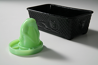 “Jadite(ジェイド)”、のちにミルクグラスの代名詞となったこの魅惑的なカラーの発祥は、1893年のシカゴ万博の頃にまでさかのぼります。当時アメリカではオリエンタリズムが台頭し、日本をはじめとしたアジア諸国、とくに中国への関心が高まっていた時代でした。そんななかで中国の伝統的な宝石である翡翠、または翡翠を用いた玉彫工芸の美しさに、多くの人々が魅せられていたのです。そうした時流から、いくつかのグラスカンパニーがこのオリエンタルの象徴である宝石、翡翠を模倣したカラーのテーブルウェアを試作するようになりました。すでに耐熱性を備えたミルクグラスの製造法は確立されていましたが、本格的にジェイドカラーの製造が開始されたのは20世紀に入ってからだったようです。