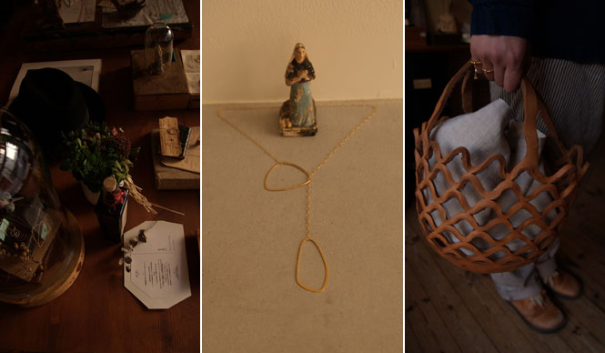 アンティークの蝋燭台にセンス良くディスプレイされたシンプルなジュエリー、味わいのある質感が冴えた古い印刷物。そしてデザインする人のデリケートな心遣いが伝わってくるクラフト感あふれる革のバッグや、親しい友人のクローゼットのなかをのぞいたような飾りけのない美しいフォルムの洋服たち。
