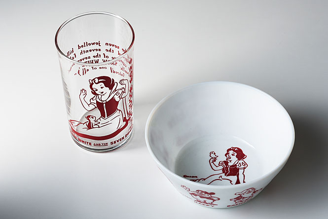 そんなディズニーからアンカーホッキング社が製作を依頼されたこのヴィトロック製のキッズ用ボウルは、'50年代初頭に『白雪姫』が再公開された時期にあわせて販売されました。ちなみにこのボウルのためだけに制作された金型は、4年後にはスクラップされてしまったそうです。劇中で使われているフォントで、ボウルに描かれている“Walt Disney's Snow White and the Seven Dwarfs”というタイトルには、ディズニーファンでなくても心を奪われるのではないでしょうか。