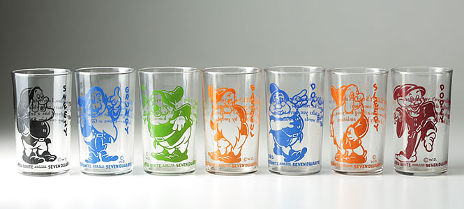 またこれと同時期には、おなじくアンカーホッキンググラスからタンブラーシリーズも発売されました。Snow white、Doc、Grumpy、Happy、Bashful、Sneezy、Sleepy、Dopeyという白雪姫と七人の小人8種類が存在し、すべてコンプリートしたくなる気持ちをかきたてるコレクターズアイテムです。