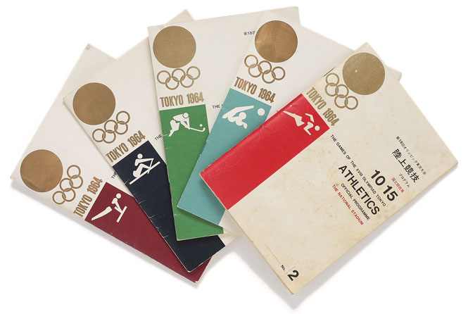 1964年の東京五輪競技別プログラム。デザインは河野鷹思。冊子に使用される書体はゴシック、欧文はノイエ・ハース・グロテスク(後のヘルベチカ)が使われている