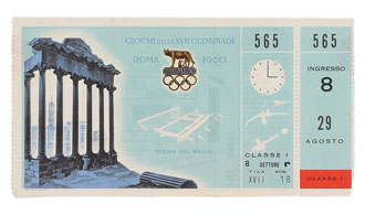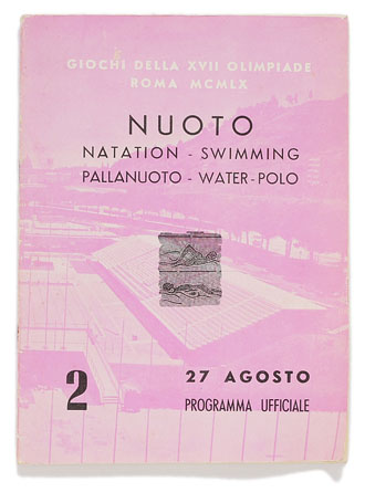 1960年に開催されたローマ五輪の水泳・水球共通プログラム(左)と入場チケット(上)。