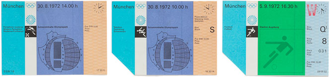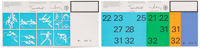 ミュンヘン大会の競技別入場チケット。入場する際に左下の角が半券としてカットされるようになっている。文字も3カ国語表記だが、グリッドシステムを採用しているため、すっきりした見え方