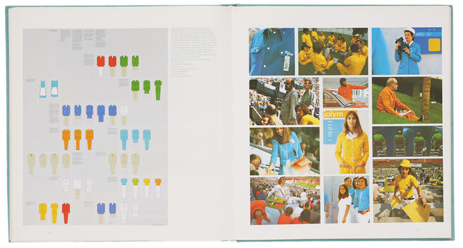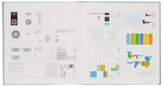 ミュンヘン五輪のマニュアル。ロゴや文字の使用基準からカラーリングなどを厳密にまとめている。ここにあるダックスフンドが大会のマスコットである「ワルディ」。会場スタッフのユニフォームにおいてもカラーリングによって職種が区分されている