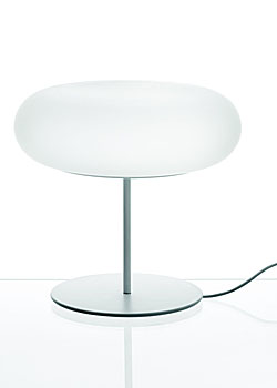 光源は蛍光灯。そのため放熱が弱く、イタリア製のフロストガラスの表面はビロードのような手触りを感じることができる。まさに触覚型の新しい照明だ。電球型蛍光灯を用いるため長寿命で、また余分な梱包材を出さずに環境への配慮も充分に考慮されている。