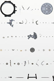 どれひとつ欠けても正常に作動しない、時計の骨組みのすべてが並べられています。