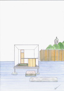 建設地は「LE STANZE DEL VETRO」に隣接する教会との間にある空地部分。この地が水の都市であり、またヴィネチアンガラスで名高い都市であることに着想を得て、テーマは「水」と「ガラス」とした。複数の日本的な素材を構成要素として、ガラスの茶室とその背景となるランドスケープを創り出している。