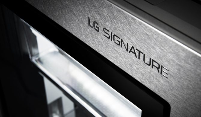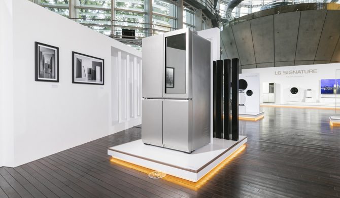 足を踏み入れてすぐの場所にあった「LG SIGNATURE InstaView™Door-in-Door®冷蔵庫」に早くも興味津々。これは、冷蔵室439ℓ、冷凍室237ℓの大容量モデル。右ドアにはガラス扉が付けられ、軽く2回ノックするとライトが点灯して庫内が見えるというギミック付き。また、足元センサーで冷蔵庫の右ドアが自動でオープンする。