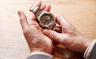 「MTG-S1000」を実際に手に取ると、まず仕上げの美しさに驚かされる。ケース斜面やベゼル、ベルトの一部には、研磨技術の最高峰であるザラツ研磨をほどこし、高級感あふれるミラー面を創出。これがベゼル表面などサテン仕上げとのコントラストを生み、4層ダイヤルと相まって、きわめて立体的な外観を構成している。「MRG-G1000」には、ソーラー電波機能にくわえて、GPSによる時刻修正機能が搭載された。ケースやブレスレットに軽量なチタンを採用しているため、見た目以上に軽快な着け心地だ。