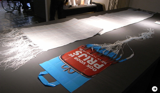 また、前編で紹介したようなテキスタイルに焦点を当てたものも複数あったが、印象的だったのはMichelle Baggremanのデザインだ。使い古したプラスチック製のバッグに加工をほどこして織物にし、これまでにないあたらしいファブリックを作り出していた。チープなプラスチック素材を異なる特性をもった強度の高いファブリックに変身させる手法がすごい。