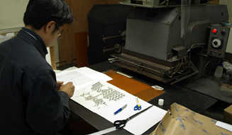 そのパチカの加工は、東京下町にある箔押し工場で行われました。広範囲に渡る意匠に圧力をかける際に、目には見えないほどの型のゆがみや、紙の厚みの差、機械の調子などが影響してしまいます。