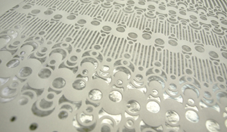それを、一枚の薄紙を鉄板の下に入れるというごくわずかな調整を繰り返すことで、均一に透過した模様が浮かび上がってくるのです。また、高橋さんのデザインは、繊細で美しいだけではなく、シェードを円筒形に保つべく、一定間隔で柄を配置するなどして、加工後のパチカのゆがみを最小限に抑える工夫がなされています。