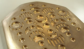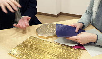 今回は、よく使われる腐食版や銅版ではなく、厚みが2cmほどもある非常に重い真鍮版を使用し、均一に重みと熱をかけることにより、柄をはっきりと出し、年月を経ても戻らないような工夫がなされています。じっくりと圧をかけるために、1時間に押せるのは数枚だそうです。また、革の厚みにはばらつきがあり、均等に力をくわえるのは大変難しいのですが、微妙な調整をしながら均一に柄をほどこす職人技をぜひ感じていただければと思います。