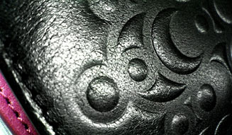 これらのアイテムの、使いやすい大きさや仕様、素材などは従来通りというなかで、表現可能な場を模索しました。布地と同様に、革は染めやプリントが可能な素材ですが、革ならではの技術とはなにかと考え、表皮の立体感を生み出す型押しの技術に注目。