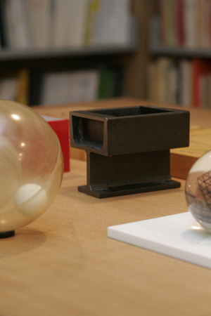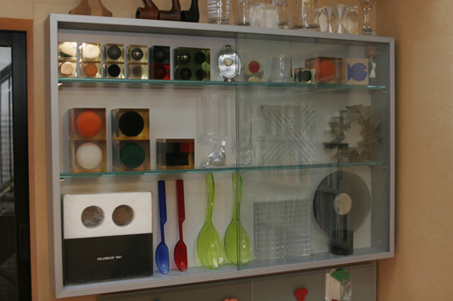 オフィスの棚に陳列された、桑野さんのコレクションの数々。エンツォ・マーリのアクリルのキューブ型オブジェがこんなにそろっているのは、なかなか見られません。