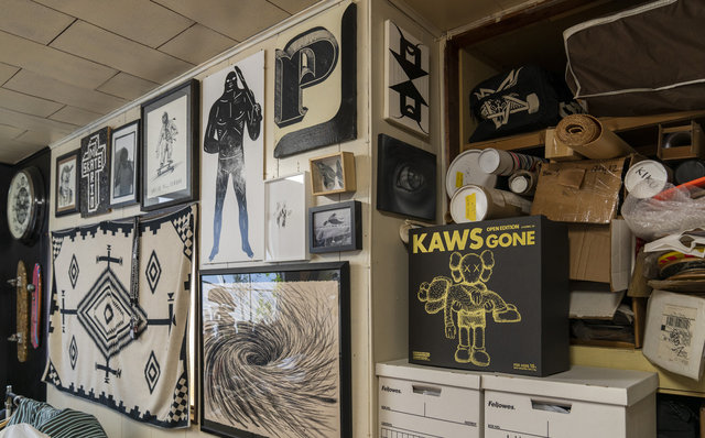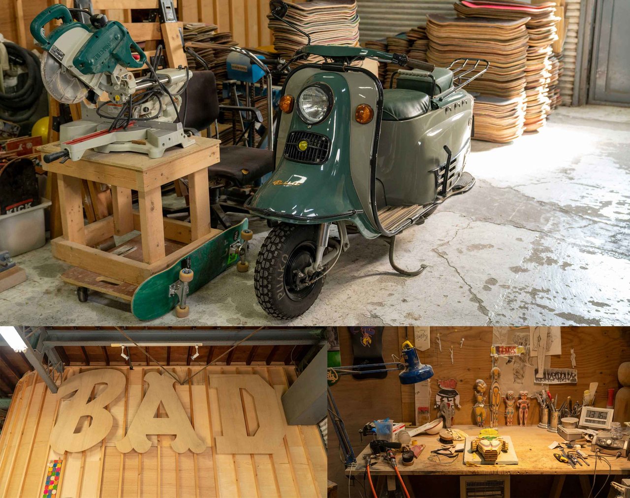 使用済みのデッキが積み重ねられたアトリエ1階には、さまざまな工具に加えて愛車のラビットも。アメリカでのエキシビション用に作った巨大な”BAD”の文字を掲げたHAROSHIの作業ブース。11月にLAのJeffery Deitchで開催されるNANZUKAキュレーションのグループ展用に「GUZO」の新作を製作中の作業机。
