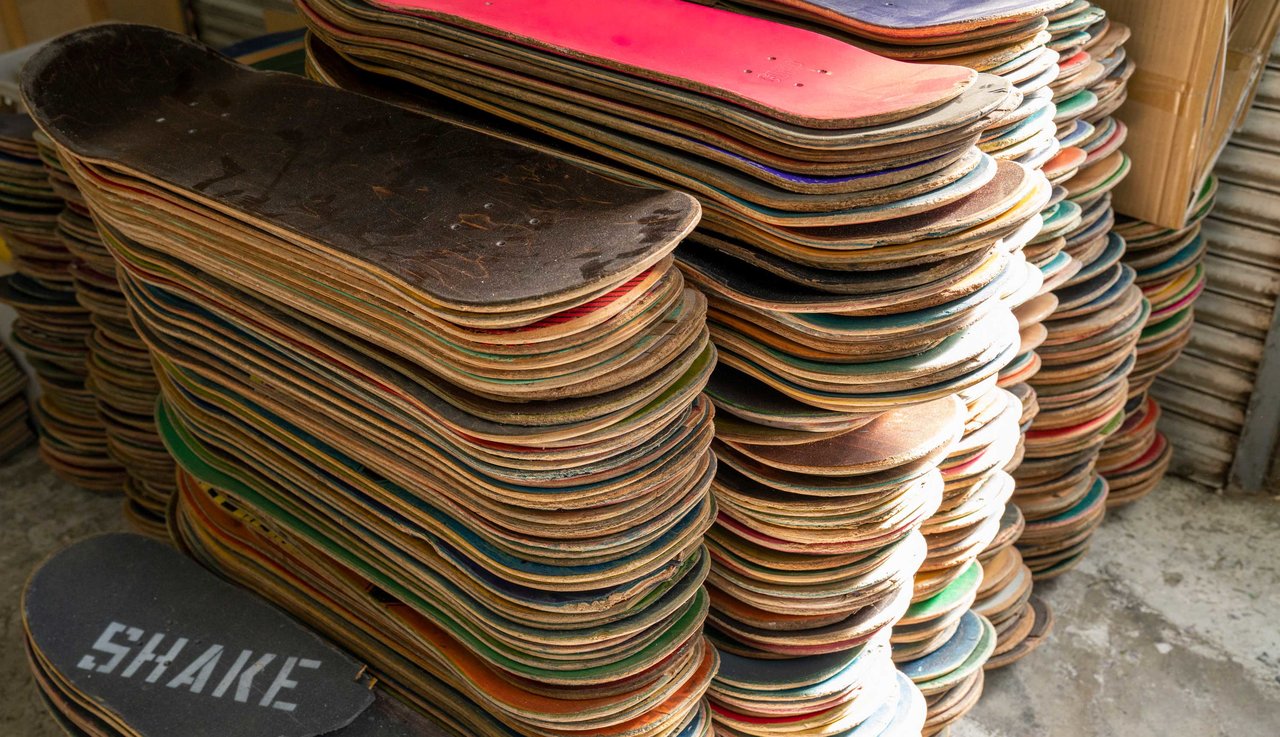 HAROSHI 最初は実際のスケートボードでカリモクさんに作ってもらおうと思って、アメリカのスケボー工場で働いている、プロスケーターの友達に頼んでスケートボードの塊を送ってもらうことにしたんです。スケボーって7枚の薄い板を圧着して作るので、それをこちらが指定したカラーの順に積んで接着してって。ただ、全然言った通りにしてくれないんです。カラフルにしてほしいと頼んだのに、ほぼグリーンの塊が届いて(笑)。そのやりとりだけで1年ぐらいかかりました。