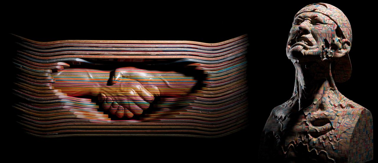 使い古されたスケートボードデッキを幾層にも積み重ねてブロック状にし、そこから削り出す彫刻作品で、世界中から注目を集めるアーティストのHAROSHI。自身もキャリアの長いスケーターだけに、ストリートで学んだ哲学に基づき生み出される唯一無二のアートピースは観る者を圧倒し、魅了していく。