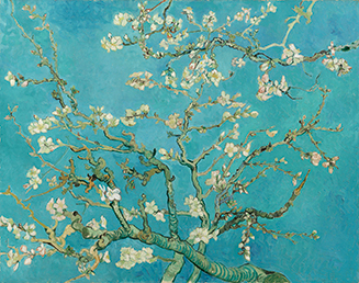 ちなみに、この『花咲くアーモンド』は、ゴッホと日本の浮世絵との関係を明かす作品のひとつでもある。19世紀の後半、ヨーロッパの印象派画家は日本浮世絵に大きく刺激を受けていた。当時パリに滞在したゴッホも浮世絵の影響を受け、自身の作品にも浮世絵の要素を盛り込んだ。力強い枝の輪郭線、木の一部を切り取る大胆な構図など、画面いっぱいにアーモンドの花が美しく咲きほこる。