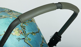 バガブーのこれまでのコラボレーションストローラーはアート作品の一部をデザインに取り入れるものだったが、今回の「Bugaboo Bee³ + Van Gogh」は、はじめて絵の全体をそのままサンキャノピーに描き込んだ。また、キャンバスの光沢感を充実に表現するため、バガブーははじめてサンキャノピーにサテン素材を採用した。絹のように滑らかなサテン生地に、アーモンドの枝とその上に咲く白い花をプリント。また、ベビーカーの本体と合皮のハンドル部分には、アーモンドの木の枝の色とマッチした光沢のあるグリーンを取り入れた。