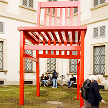 ミラノサローネ開幕の前日、ミラノ市近代美術館(GAM)でプレス発表会がおこなわれた。会場となった美術館は、春の訪れに緑がそよぐ公園の敷地内に建つ、18世紀末の由緒ある建物にある。その館の厳かな中庭に、突如巨大なふたつの真っ赤なシンボルがあらわれる。「モルテーニ」を世界的に有名にした、アルド・ロッシの名作であるロングセラーチェアー「ミラノ」と、モルテーニの80周年を驚きと賞賛をもってあらわすシンボルとなった“!”マークのオブジェだ。