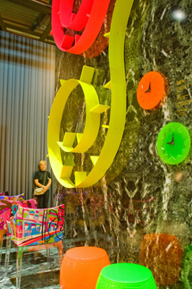 カルテルのインスタレーション。中央のソファはピエロリッソーニ氏がデザインした「LARGO(ラルゴ)」。右のフロアランプはフェルーチョ・ラヴィアーニ氏の「KABUKI(カブキ)」