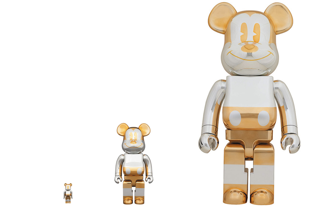 FUTURE MICKEY BE@RBRICK。各全高約70mm(100%)/280mm(400%)/700mm(1000%)。[100% & 400%]1万6000円(税別) / [1000%]6万8000円(税別)