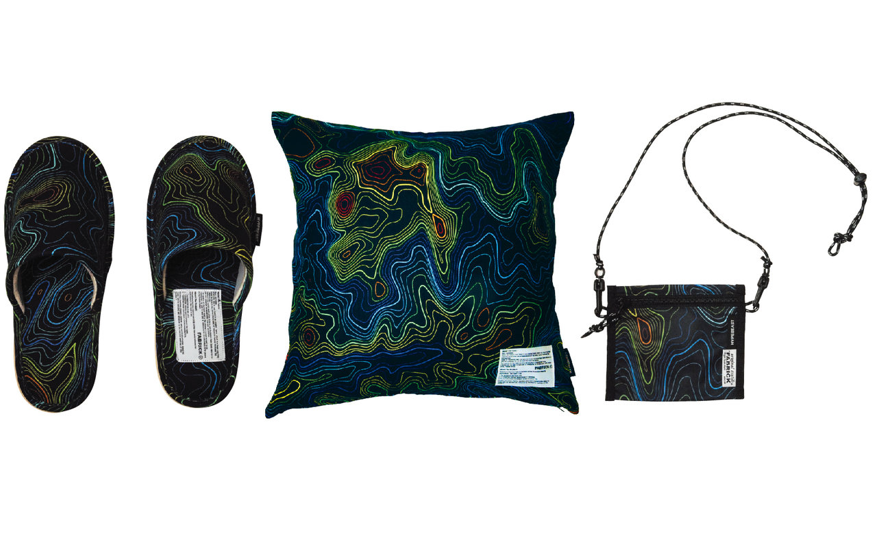 SLIPPERS(サイズ:FREE)は3800円(税別)。SQUARE CUSHION(サイズ:450x450mm)は5800円(税別)。FLAT 2WAY POUCH M(H150xW130)は3000円(税別)