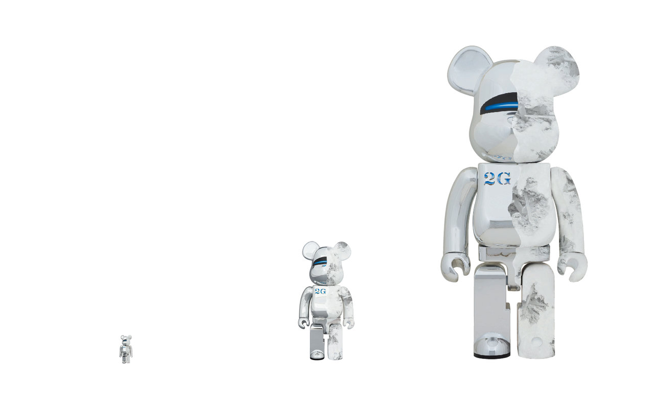 「2G」のロゴをデザインした空山基 × NYを拠点に活動するダニエル・アーシャムのBE@RBRICK。それぞれの作風を活かして片側はシルバーメッキ、もう片側はウォータープリントで表現。各全高約70mm(100%)/280mm(400%)/700mm(1000%)。[100% & 400%]2万円(税別)/ [1000%]8万8000円(税別)。