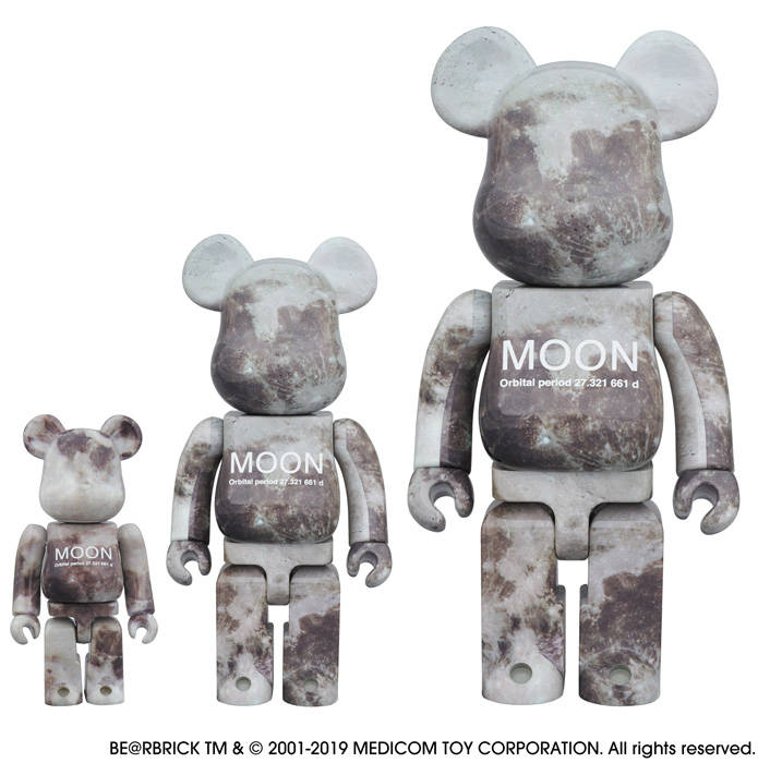 月面着陸50周年を記念して、NASAイメージライブラリーの月面写真をウォータープリントで表現したMOON BE@RBRICKが100% & 400%、1000%で登場。各全高:約70mm/280mm/700mm。100% & 400%は1万2000円(税別)。1000%は4万8000円(税別)。※本商品はNASA(アメリカ航空宇宙局)の正式許諾を受け製作されております。
