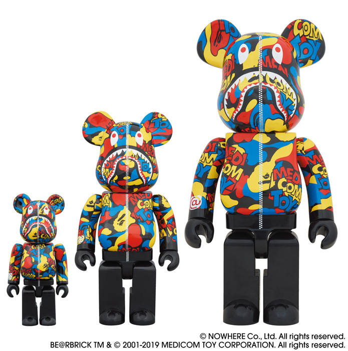 MEDICOM TOY CAMO SHARK BE@RBRICKが100%、400%、1000%の3サイズで登場。各全高:約70mm/280mm/700mm。100%は2000円(税別)。400%は1万円(税別)。1000%は6万円(税別) ※1000%サイズは会場での発送(送料別)も可能。