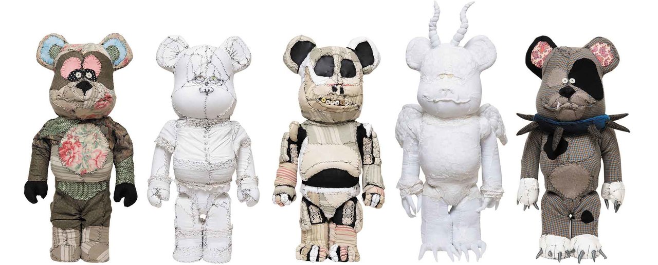 世界的に活躍するフランスのテキスタイル彫刻家、アン・ヴァレリー・デュポン本人が作成したワンオフ・アートピースのBE@RBRICK 1000%。全高約700mm。各35万円(税別)。