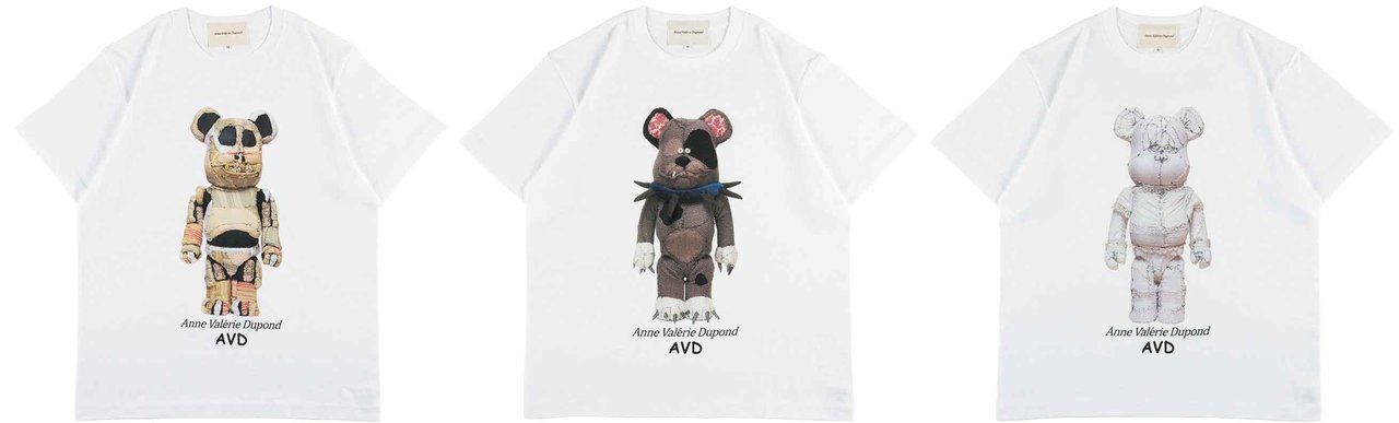 Anne Valerie Dupond ONE OF KIND BE@RBRICK 1000%のフォトTシャツは3タイプ。サイズ:M/L/XL(M:着丈 68cm, 身巾 52cm, 袖丈 22cm/L:着丈 72cm, 身巾 55cm, 袖丈 22cm/XL:着丈 75cm, 身巾 60cm, 袖丈 23cm)。素材:COTTON 100%。各6800円(税別)。