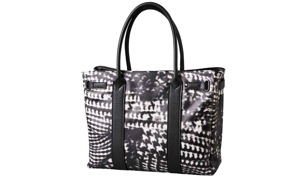 MLE 10周年を記念して登場。動いている対象をカメラで撮影した時に生じるブレを表現したオリジナルテキスタイルのベルトトートバッグ。H28cm x W36cm。30000円(税別)。