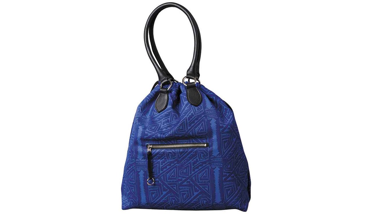 MLE 10周年を記念して登場。アメリカ・インディアンの部族のホピ族とアフリカ大陸サハラ砂漠の遊牧民トゥアレグ族の伝統柄をミクスチャーしたオリジナルテキスタイルを使用したドローストリングバッグ。約H40cm x W36cm。23000円(税別)。