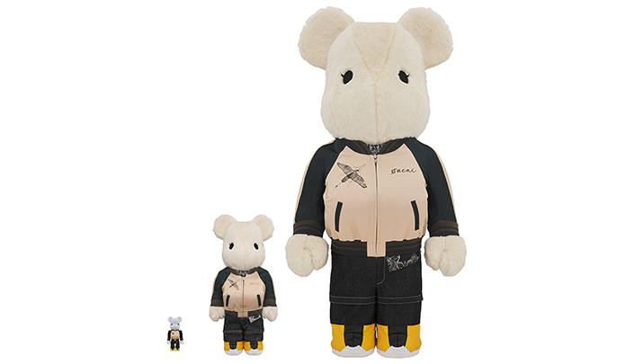 sacaiのBE@RBRICKは2017年以来、年に一度のペースで発表されているが、3デザイン目となる今回はそのDr. Wooとのコラボレーションによる、ブルゾンを着用した姿で登場。400%と1000%モデルは着ぐるみ仕様。sacaiのハイブリッド感を存分に味わってほしい。