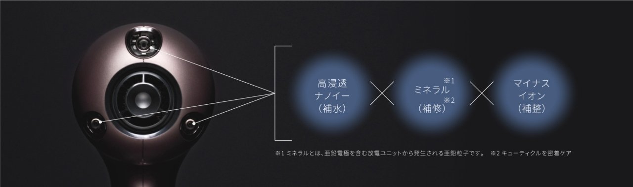 切り替えの裏側では、「高浸透ナノイー(補水)」「ミネラル※1(補修)※2」「マイナスイオン(補正)」と、3種類のケア成分の発生量が制御されている。つまり、ドライヤーで髪を乾かすだけで、髪質に合わせた自分だけのケアができてしまう。