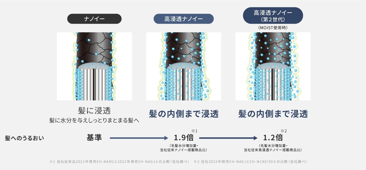 ※2 毛髪水分増加量・パナソニックの従来高浸透ナノイー搭載商品比