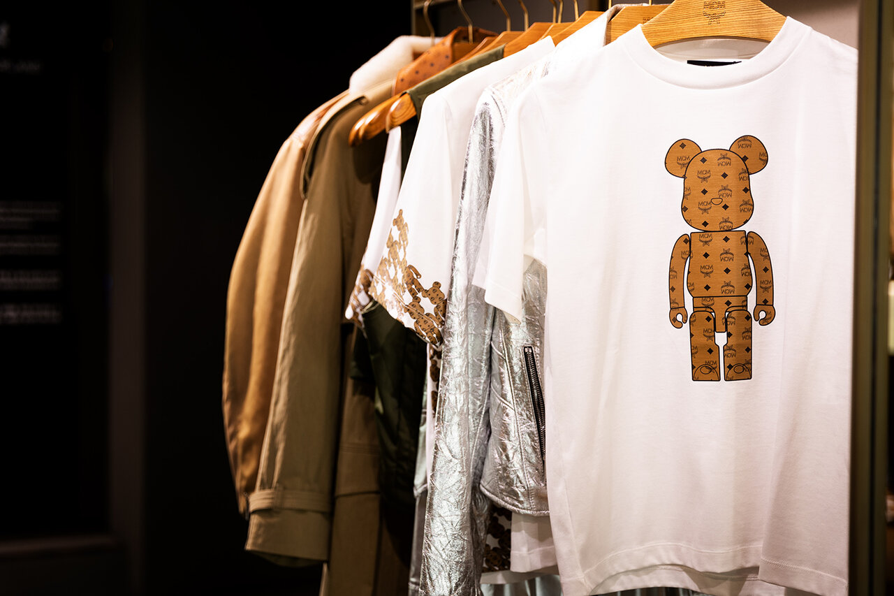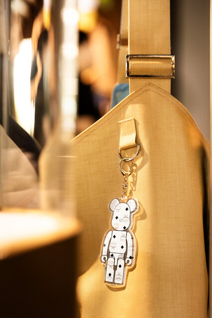 1Fのフロアでは、インテリアとして各所にBE@RBRICKが置かれていた。また、今回のエキシビションのために特別にデザインされた限定MCMプリントTシャツや、ショルダーバッグ、チャームなども販売されている。