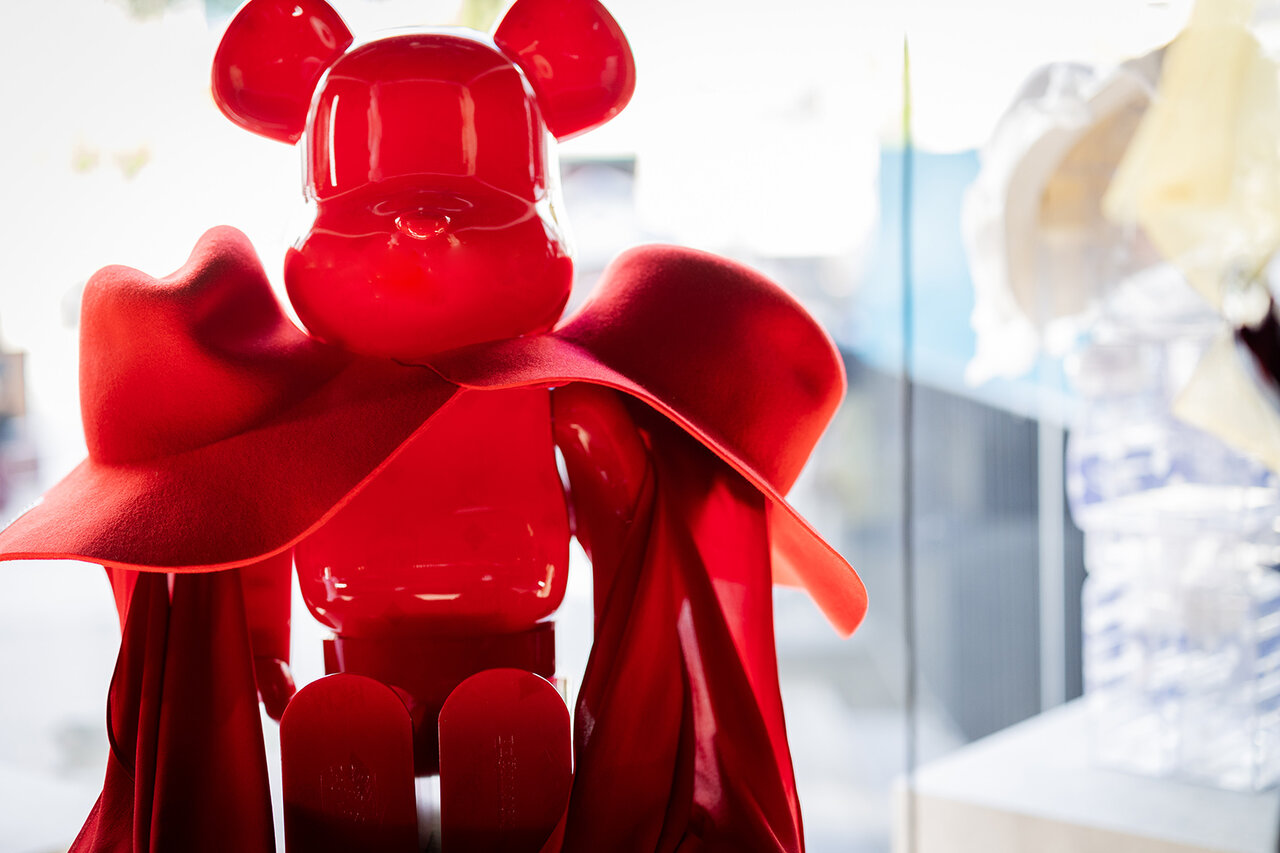 「BE@RBRICK in MCM Wonderland」の期間中、1Fのショーウィンドウを飾るのは、帽子&ヘッドピース デザイナーの日爪ノブキ氏による作品。赤と白の1000% BE@RBRICKが並び、そこには日爪氏の帽子がディスプレイされている。今回、このエキシビションのためにつくられたのは、彼の作品「オリンピア レッド」をベースにしたアートピースだ。