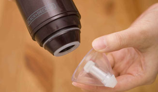 使用方法は、付属のコンテナ容器や真空パック袋のアタッチメントに吸引口を密着させて上面のスイッチを押すだけ。ワインのフルボトルの半分量を約17秒、1200mL容器の半分量を約37秒で手軽に真空にすることができる。